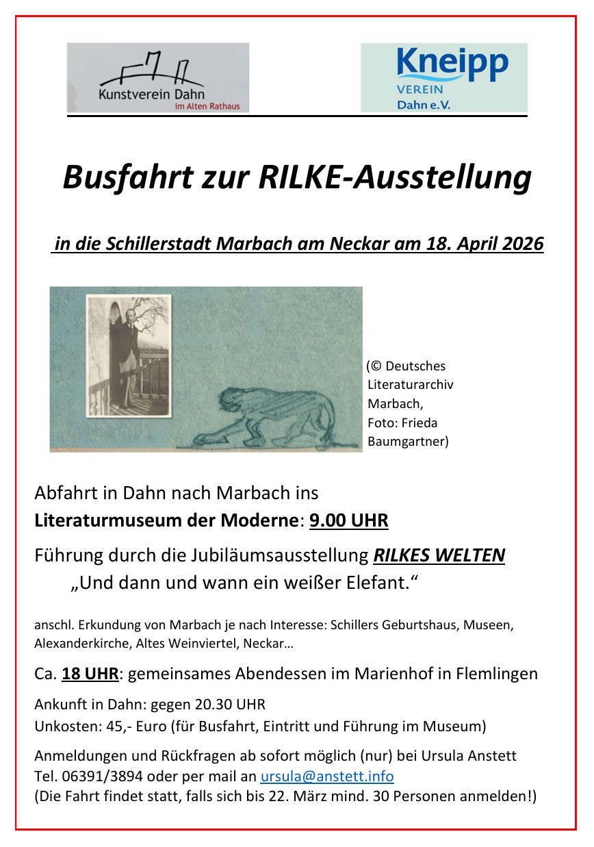 Der Kunstverein und der Kneipp-Verein Dahn laden ein: Was erwartet uns?Abfahrt in Dahn: 10.30 UHRFührung in der Kunsthalle in Mannheim durch die Ausstellung „Geschichten des Expressionismus in Mannheim: Kirchner, Lehmbruck, Nolde“• anschl. beliebig langer Aufenthalt in der Kunsthalle• Besuch der zahlreichen Mannheimer Weihnachtsmärkte• Bummel durch die Mannheimer Innenstadt etc.Rückfahrt in Mannheim: 19.30 UHRUnkosten: 35,- Euro [...]